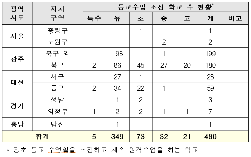 ※ 등교수업일 조정학교 총 6개교 : 서울 2개교, 광주 1개교, 경기 2개교, 충남 1개교