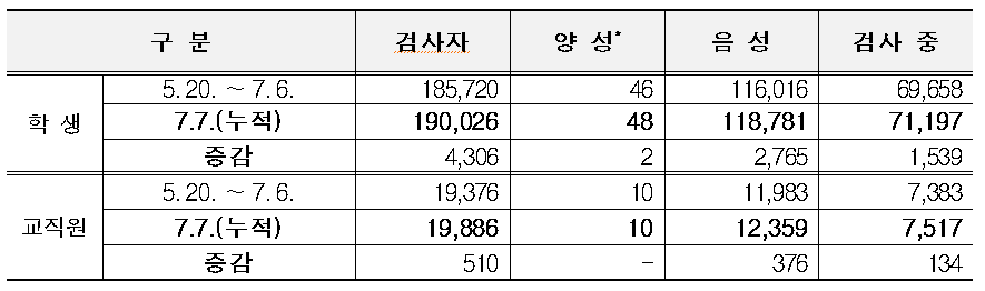 등교 이후 진단검사 현황(7.8. 00시 기준)