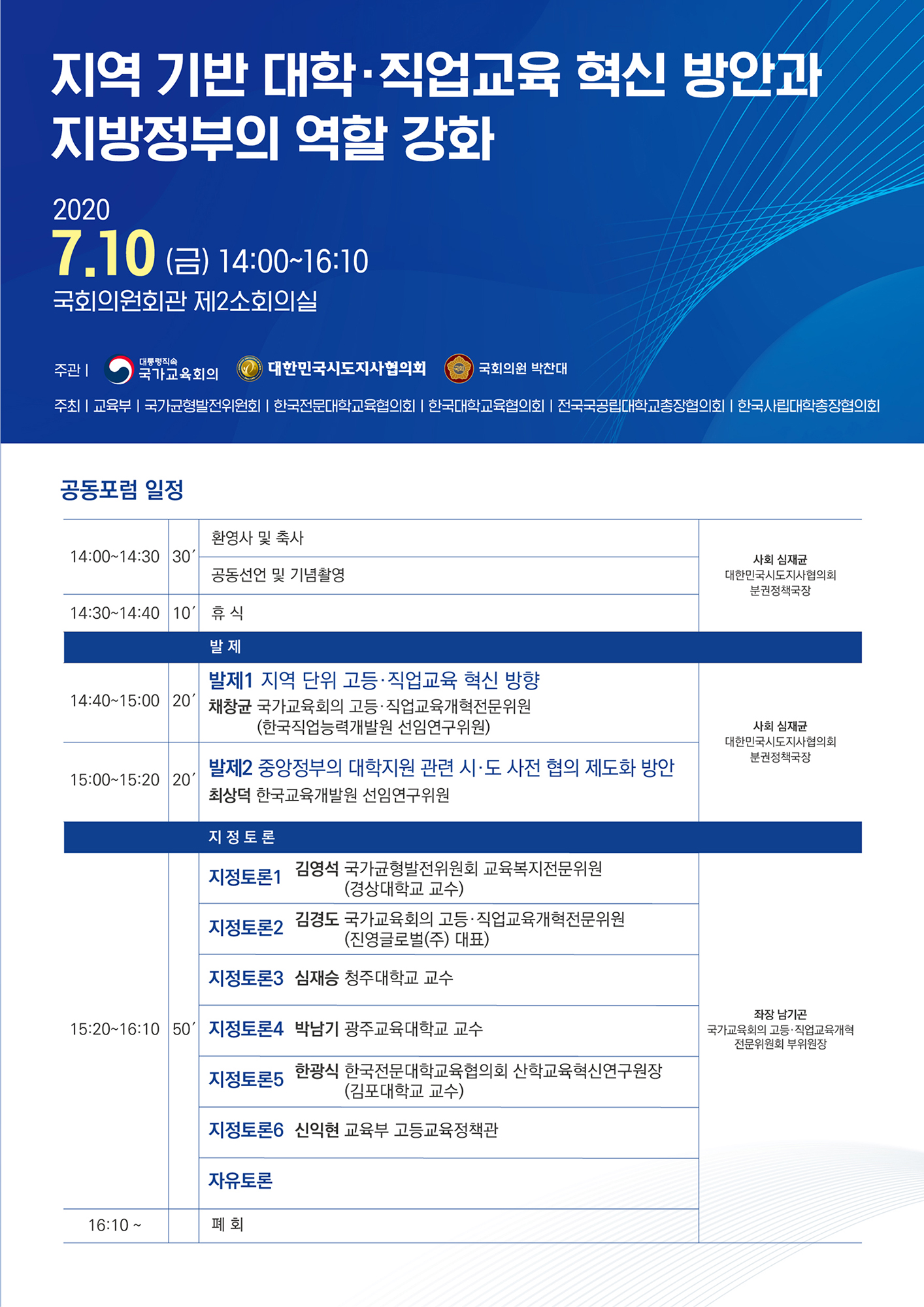 7월 10일(금), 오후 2시부터 서울 여의도 국회의원회관 제2소회의실에서 개최되는 『지역 기반 대학·직업교육 혁신 방안과 지방정부의 역할 강화』포럼은 대통령직속 국가교육회의와 대한민국시도지사협의회, 국회의원 박찬대 의원(국회 교육위 간사)이 공동주관하며, 교육부‧국가균형발전위원회‧한국전문대학교육협의회‧한국대학교육협의회‧전국국공립대총장협의회‧한국사립대학총장협의회가 공동주최한다.