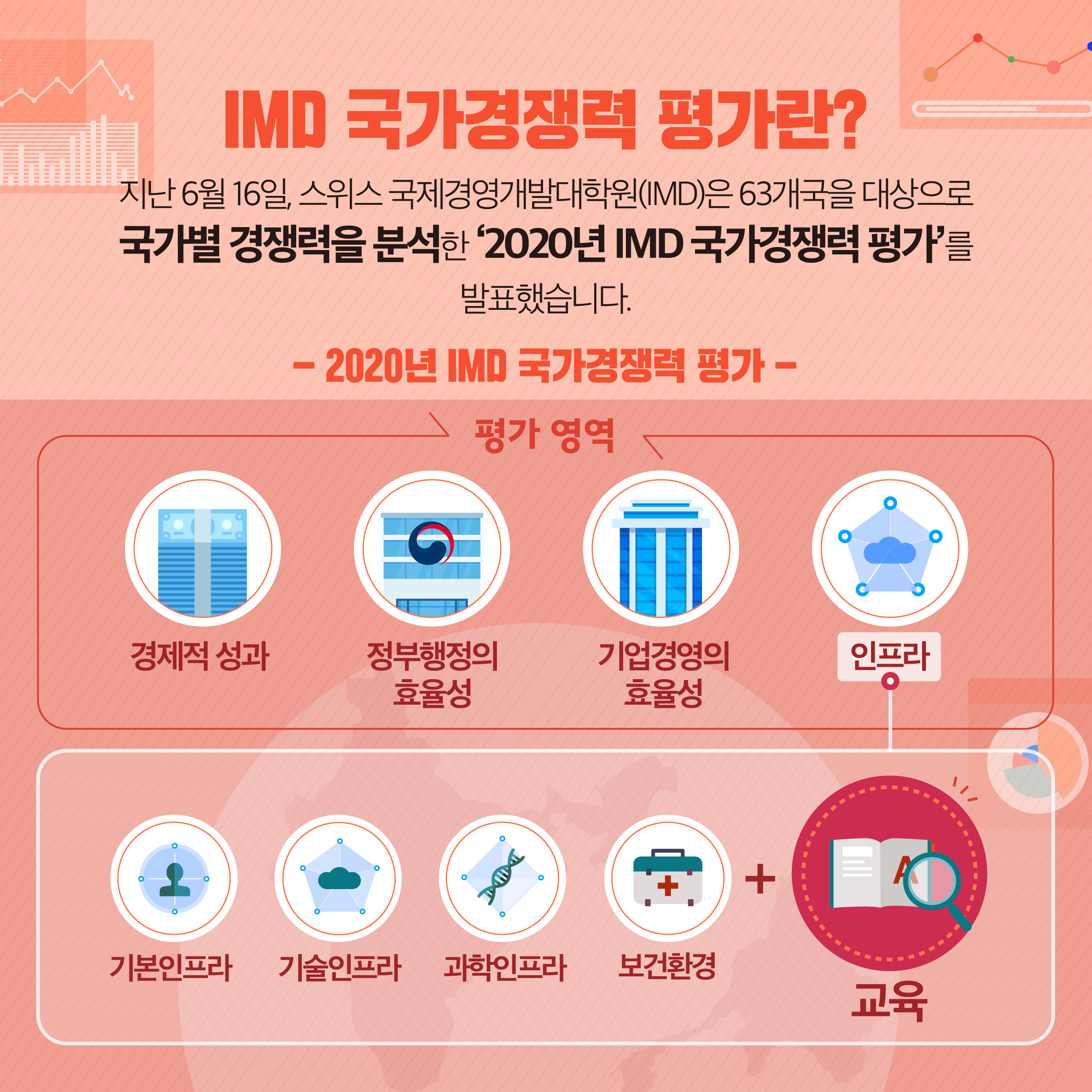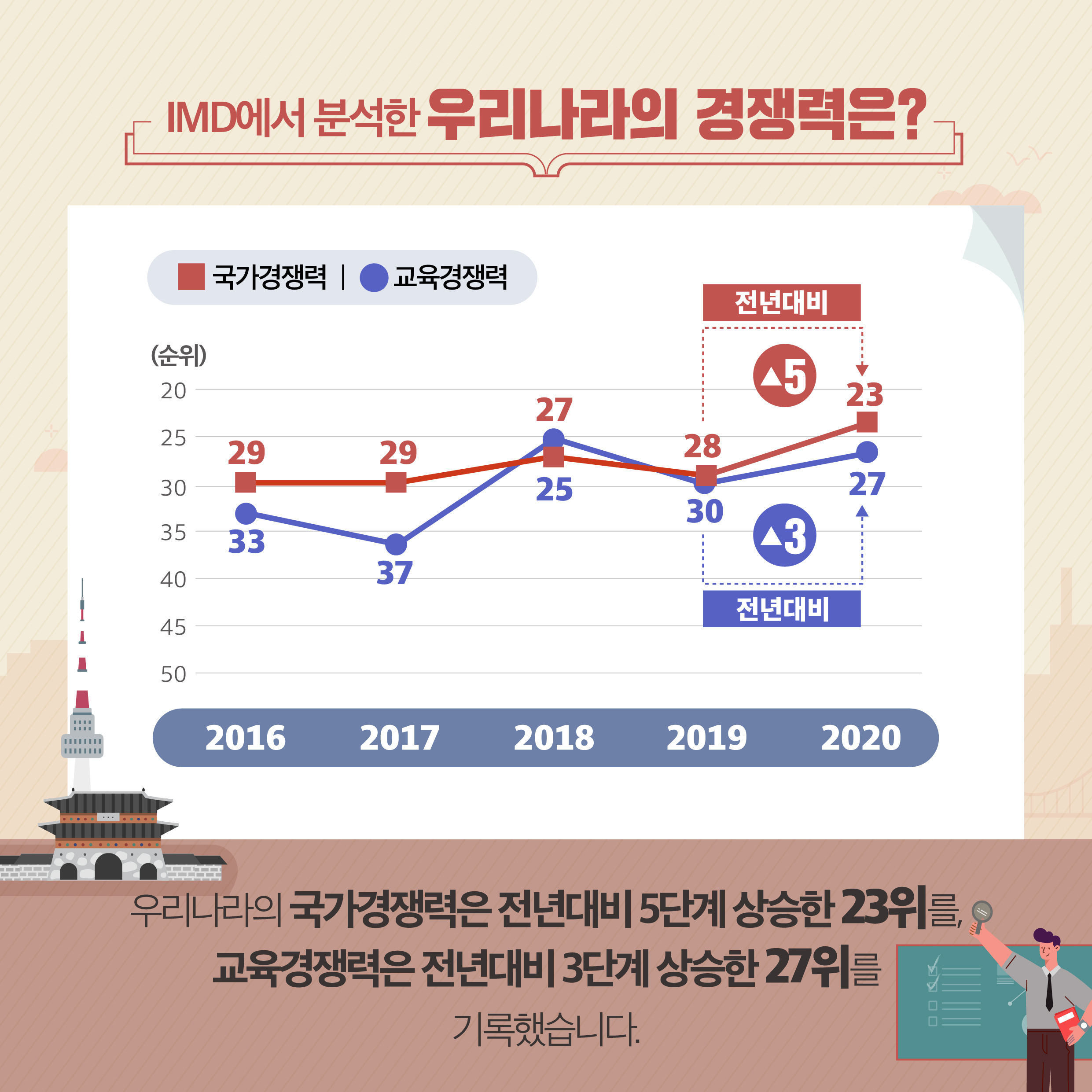 IMD에서 분석한 우리나라의 국가 경쟁력은 전년대비 5단계 상승한 23위를,