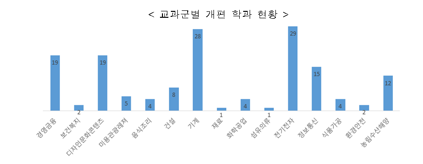 선정 결과 전기·전자 분야(29개) 기계 분야(28개)의 학과 개편이 가장 많았고, 디자인·문화콘텐츠 분야(19개)와 경영금융 분야(19개)의 개편이 뒤를 이었다.