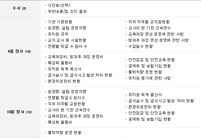 2012년 9월부터 유치원 정보공시제도 포털사이트가 개통됨에 따라 7개 항목, 21개 범위에서 매년 1회 이상 유치원의 주요 정보들이 공시되고 있는데요. 공시 기준에 따라 원아·교직원 현황, 유치원 회계 현황, 환경위생 및 안전관리 사항 등 유치원의 주요 정보를 공시하고 있습니다.
