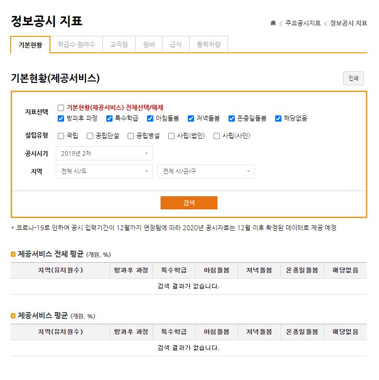 정보공시 지표의 경우 기본현황부터 교직원, 원비, 급식 등을 클릭하여 지표를 선택하거나 설립유형, 공시 시기, 지역 등을 선택해주시면 맞춤형으로 정보를 제공하고 있습니다. 그렇기 때문에 꼭 필요한 정보만을 쏙쏙 골라낼 수 있으니 번거롭게 찾으러 다닐 필요도 없습니다.