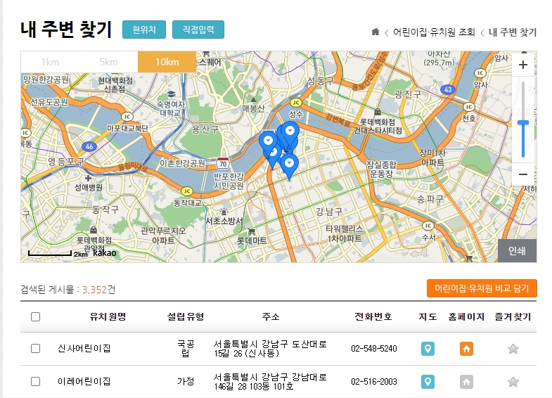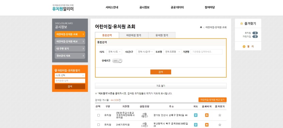 첫 번째, 어린이집과 유치원을 조회할 수 있습니다.