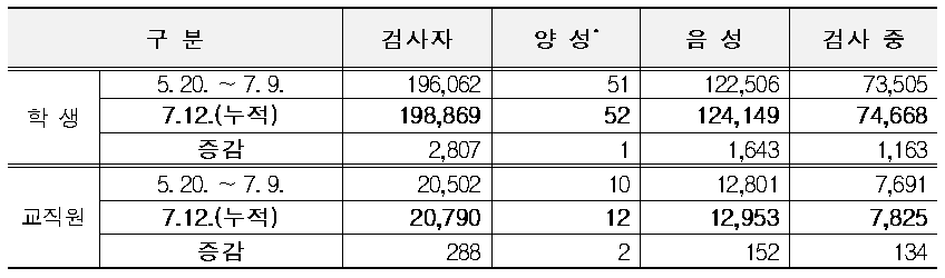등교 이후 진단검사 현황(7.13. 0시 기준)