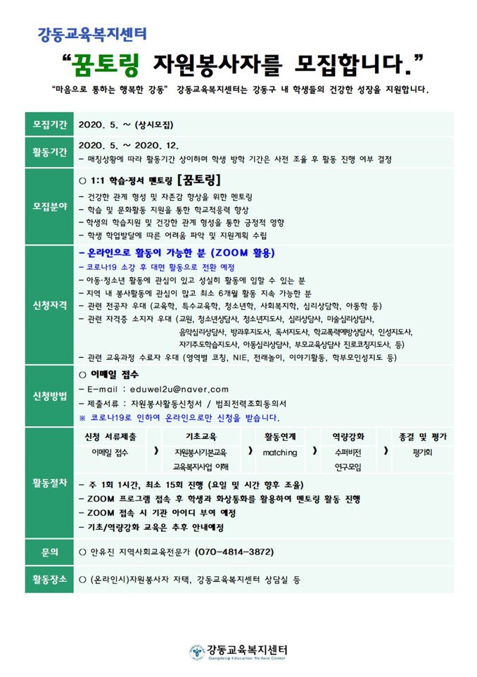 '강동 교육복지센터'는 온라인 화상회의 플랫폼을 통해 1:1 학습·정서 멘토링을 진행할 꿈토링 자원봉사자를 모집하고 있습니다. 이와 같이 교육 봉사는 아이들의 학습권 보장과 전인 발달 도모를 목표로 하기 때문에 아이들에 대한 애정과 열정을 기반으로 아이들과 적극적으로 소통하고자 하는 사람들에게 추천하는 활동입니다. 또한 그중에서도 특정 분야에 대한 전문 지식을 보유하고 있는 전공자 혹은 교육 계열 종사자가 이 봉사 유형에 적합하다고 볼 수 있습니다.