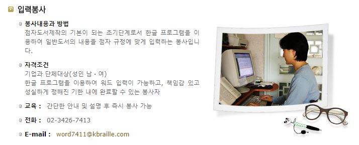 '한국점자도서관'은 시각장애인 및 독서 장애인의 삶의 질 향상을 위하여 점자 도서와 녹음도서(디지털 토킹북)를 제작하여 전국 각지에 무료로 대출·배포하고 있는 기관입니다. 이곳에서 진행하는 워드 입력 및 교정 봉사활동은 성인을 대상으로 하며 한글 프로그램을 이용하여 워드 입력이 가능하고, 책임감 있고 성실하게 정해진 기한 내에 완료할 수 있는 봉사자를 상시 모집하고 있다고 합니다. 이처럼 워드 입력 및 교정 봉사활동은 정확하게 내용을 입력하는 능력과 주어진 기간 내에 문서 작업을 완수하는 책임감 있는 자세를 동시에 요구하기 때문에 성실하고 꼼꼼한 성격이라면 워드 입력 및 교정 봉사활동에 도전해 봐도 좋을 듯합니다!