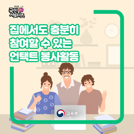 봉사활동에 있어서도 이러한 '언택트' 라는 새로운 지향점을 향한 변화의 물결이 일고 있다는 사실! 대면 활동이 아니어도, 가정이나 사무실 등 편한 개인 공간에서 '따로 또 같이' 참여할 수 있는 봉사활동이 있다고 합니다. 그럼 지금부터 비대면, 온라인으로 진행되는 언택트 봉사활동에는 어떤 것들이 있는지 2020 교육부 국민 서포터즈와 함께 알아볼까요?