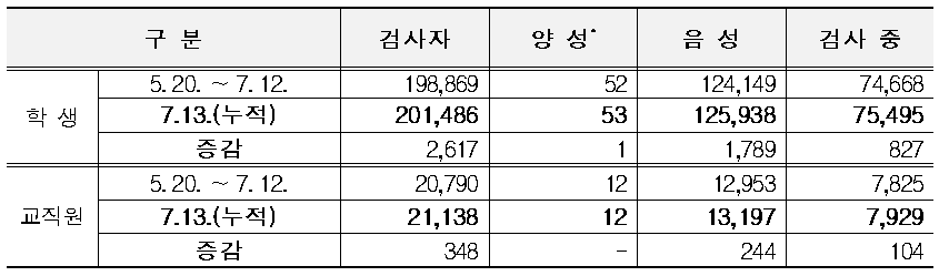 등교 이후 진단검사 현황(7.14. 0시 기준)