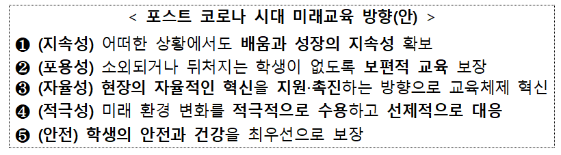 한편, 「포스트 코로나 교육 대전환을 위한 대화」는 미래교육 체제로의 혁신을 위한 방향과 과제를 모색하고자 교육부가 지난 6월 17일(수)부터 추진해오고 있다.
