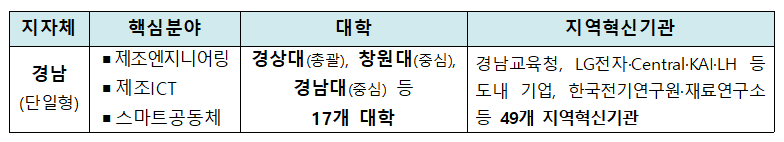 경남은 17개 대학, 49개 지역혁신기관 등으로 플랫폼을 구성, ‘제조엔지니어링’, ‘제조ICT’, ‘스마트공동체’ 3개 핵심분야를 선정하였다.