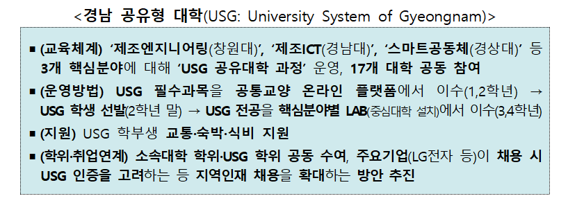 특히, 경남은 지역 내 협의과정을 거쳐 공유대학인 ’USG 모델’을 개발, 이를 실현하기 위한 지자체·대학·산업체의 협업노력을 극대화하여 ‘지방대학의 경쟁력 확보를 위한 혁신적 시도’라는 평가를 받았다.