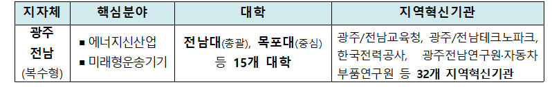 광주·전남은 두 개 지자체가 연합, 15개 대학, 32개 지역혁신기관 등으로 플랫폼을 구성, ‘에너지신산업’, ‘미래형운송기기’ 2개 핵심분야를 선정하였다.