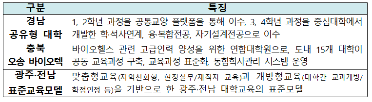 국내 처음으로 지역단위에서 추진되는 공유대학 모델들은 대학의 온라인 교육인프라 및 지역대학 간 협력체계를 바탕으로 운영하며, 이를 통해 공동 교육과정의 효율적 운영, 공동·복수학위 추진을 도모할 수 있다.