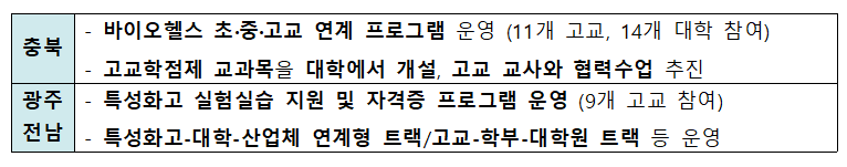 특히, 광주·전남에서는 대학이 공동 LMS 시스템을 통해 고교학점제 선도지구 내 고교에 비대면 학습콘텐츠를 제공하고, 교원의 다과목 지도역량 강화를 지원하여 핵심분야 산업의 생애주기적 인력양성체계를 공고화하는 계획을 마련하였다.