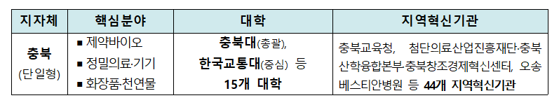 충북은 15개 대학, 44개 지역혁신기관 등으로 플랫폼을 구성, ‘제약바이오’, ‘정밀의료·기기’, ‘화장품·천연물’ 등 바이오 산업과 관련된 3개 분야를 핵심분야로 선정하였다.