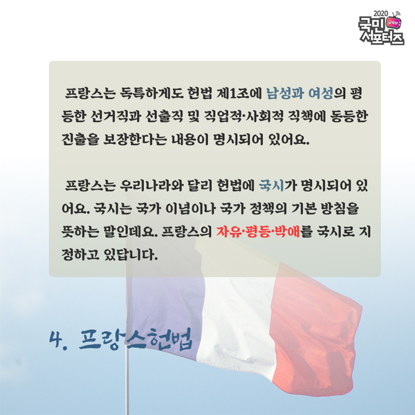 프랑스는 독특하게도 헌법 제1조에 남성과 여성의 평등한 선거직과 선출직 및 직업적·사회적 직책에 동등한 진출을 보장한다는 내용이 명시되어 있어요. 프랑스는 우리나라와 달리 헌법에 국시가 명시되어 있어요. 국시는 국가 이념이나 국가 정책의 기본 방침을 뜻하는 말인데요. 프랑스의 자유·평등·박애를 국시로 지정하고 있답니다.