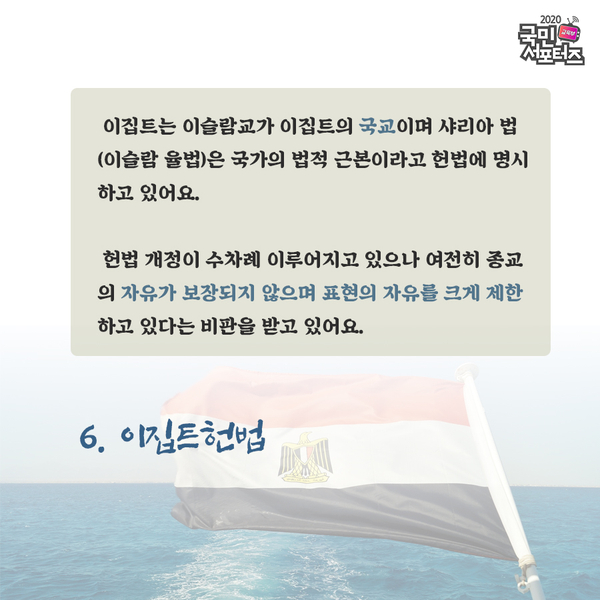 이집트는 이슬람교가 이집트의 국교이며 샤리아 법(이슬람 율법)은 국가의 법적 근본이라고 헌법에 명시하고 있어요. 헌법 개정이 수차례 이루어지고 있으나 여전히 종교의 자유가 보장되지 않으며 표현의 자유를 크게 제한하고 있다는 비판을 받고 있어요.