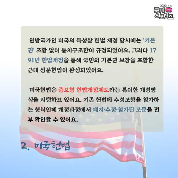 연방국가인 미국의 특성상 헌법 제정 당시에는 ‘기본권’ 조항 없이 통치구조만이 규정되었어요. 그러다 1791년 헌법 개정을 통해 국민의 기본권 보장을 포함한 근대 성문헌법이 완성되었어요. 미국헌법은 증보형 헌법개정제도라는 특이한 개정방식을 시행하고 있는데요. 기존 헌법에 수정조항을 첨가하는 형식으로 개정과정에서 폐지·수정·첨가된 조문을 전부 확인할 수 있어요.