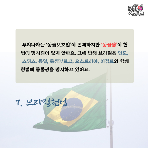 우리나라는 ‘동물보호법’이 존재하지만 ‘동물권’이 헌법에 명시되어 있지 않아요. 그에 반해 브라질은 인도, 스위스, 독일, 룩셈부르크, 오스트리아, 이집트와 함께 헌법에 동물권을 명시하고 있는 것이 특징이에요.