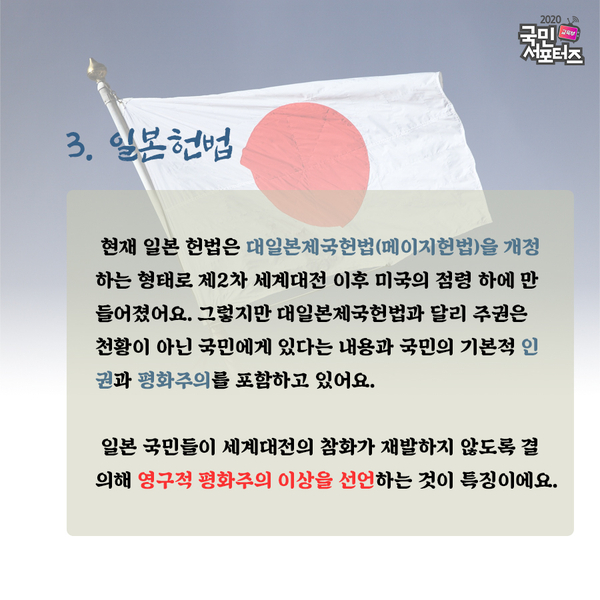 현재 일본 헌법은 대일본제국헌법(메이지헌법)을 개정하는 형태로 제2차 세계대전 이후 미국의 점령 하에 만들어졌어요. 그렇지만 대일본제국헌법과 달리 주권은 천황이 아닌 국민에게 있다는 내용과 국민의 기본적 인권과 평화주의를 포함하고 있어요. 일본 국민들이 세계대전의 참화가 재발하지 않도록 결의해 영구적 평화주의 이상을 선언하는 것이 특징이에요.