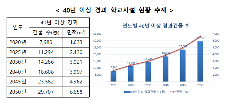 전체 학교시설의 약 20%에 해당하는 7,980동이 ‘40년 이상 경과된 노후건물’로서 향후 노후화가 빠르게 증가할 것으로 예상되는 만큼 학생들의 안전한 학습환경 보호를 위해 이 시설들의 개선이 시급한 상황이다.
