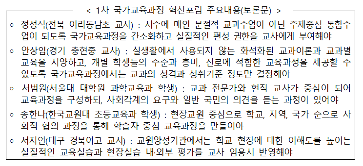 1차 포럼에서는 홍원표 연세대 교수의 진행으로 현직 및 예비교사 5명이 토론자로 나와 ‘학습자 중심의 교육과정 개편’ 필요성과 문제점, 개편 방향, 교육과정 개편 기준 등에 대해 토론한다.