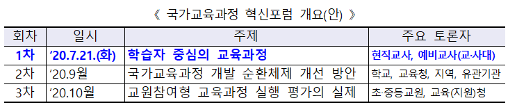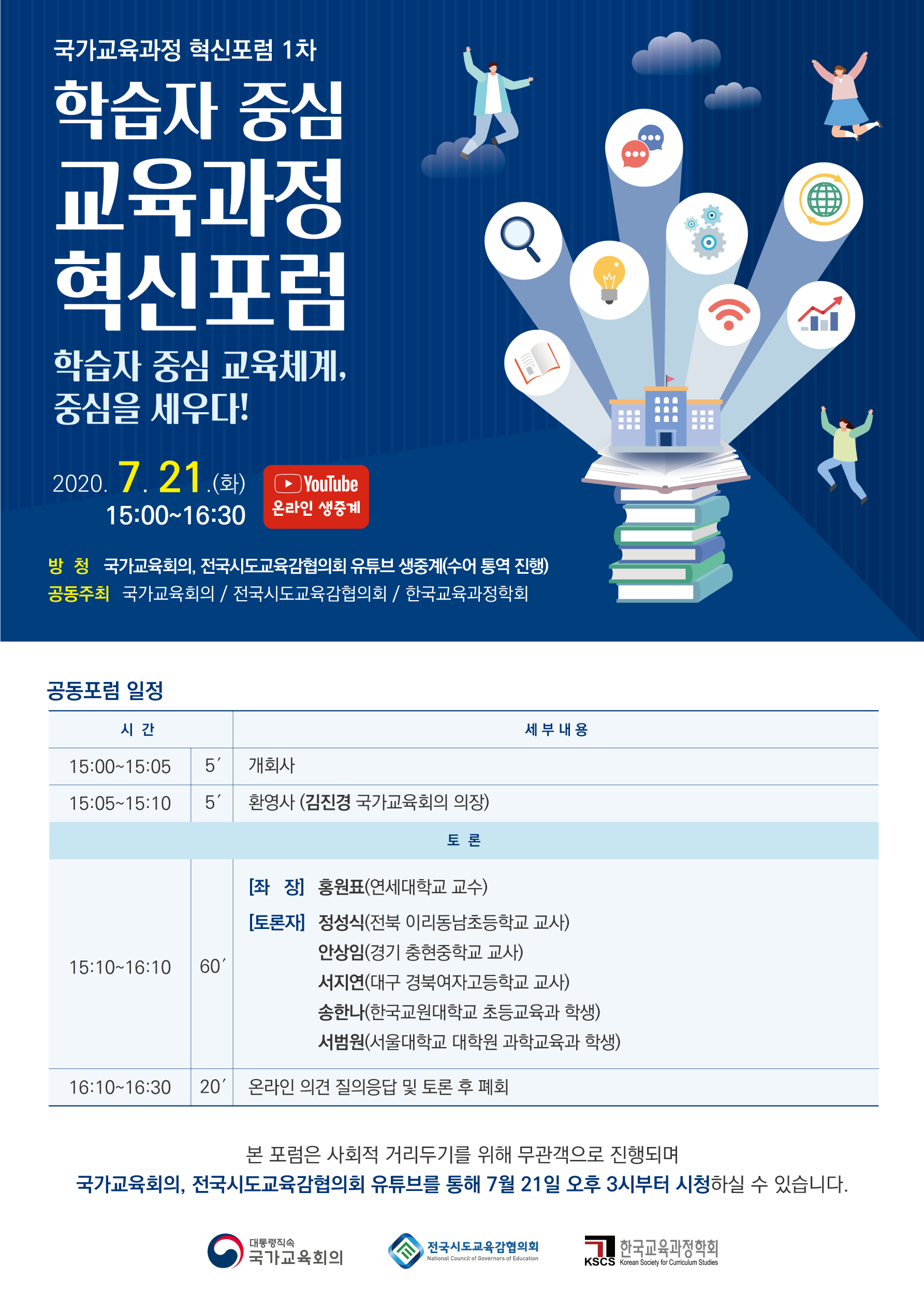 1차 포럼은 7월 21일(화), 오후 3시 서울 은평구 서울창의예술교육센터(제1센터)에서 ‘학습자중심 교육체계, 중심을 세우다’란 주제로 개최되며, 국가교육회의와 전국시도교육감협의회 유튜브를 통해 무관객 온라인 생중계 된다.