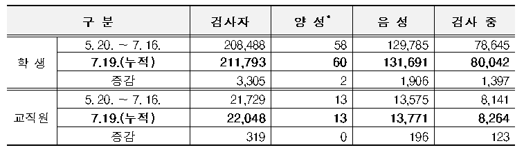 등교 이후 진단검사 현황(7.20. 0시 기준)