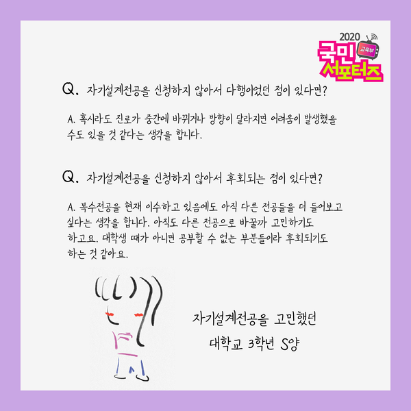 A : 혹시라도 진로가 중간에 바뀌거나 방향이 달라졌다면 어려움이 발생했을 수도 있을 것 같아요. 그래서 다행이에요. 하지만 공부를 하다 보니 복수전공을 이수하고 있지만 다른 전공을 더 들어보고 싶다는 생각을 해요. 다른 전공으로 바꿀까 고민하기도 하고요. 대학생이 아니면 공부할 수 없는 부분들이라 그 부분이 약간 후회되는 것 같아요.