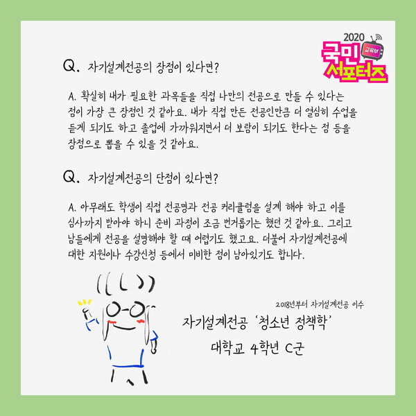 먼저, ‘청소년 정책학’이라는 자기설계전공을 이수하고 있는 학생의 인터뷰 내용입니다.
