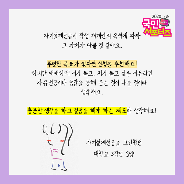 A : 자기설계전공이 학생 개개인의 목적에 따라 그 가치가 다를 것 같아요. 뚜렷한 목표가 있다면 신청하기를 추천합니다. 하지만 애매하게 이거 듣고, 저거 듣고 싶은 이유라면 자유전공이나 청강을 통해 듣는 것이 좋을 것 같아요. 충분히 생각하는 시간을 갖고 결정하기를 바랍니다.