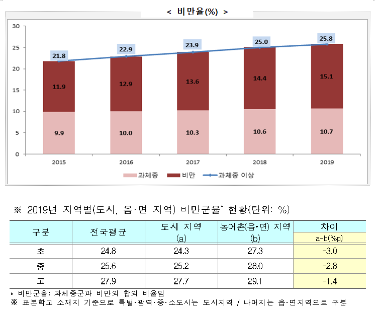 또한 과체중 이상 비율은 25.8%(비만 15.1% + 과체중 10.7%)로, 최근 5년간 매년 1%p 수준으로 증가하였고, 도시규모별로는 농·어촌지역이 도시지역보다 높았다.