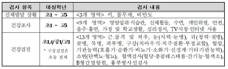 ※ 초‧중‧고 표본학교의 전학년에 대한 신체발달 상황(104,281명) 및 건강조사(102,187명) 결과와 초 1‧4학년, 중‧고 1학년에 해당하는 34,651명에 대한 건강검진 결과 분석