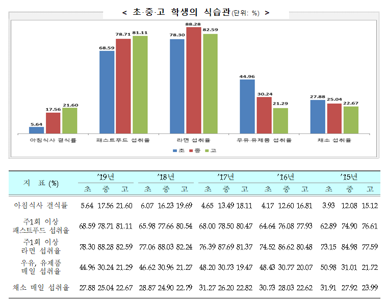 영양 및 식습관 지표 중 개선이 필요한 식습관인 ‘아침식사 결식률’, ‘주 1회 이상 패스트푸드 섭취율’은 학교급이 올라갈수록 높았다. ‘주 1회 이상 패스트푸드 섭취율’, ‘주 1회 이상 라면 섭취율’은 각각 70~80%, 80~90% 수준이었다. ‘아침식사 결식률’, ‘주 1회 이상 패스트푸드 섭취율’, ‘주 1회 이상 라면 섭취율’은 최근 5년간 큰 차이가 없었다.