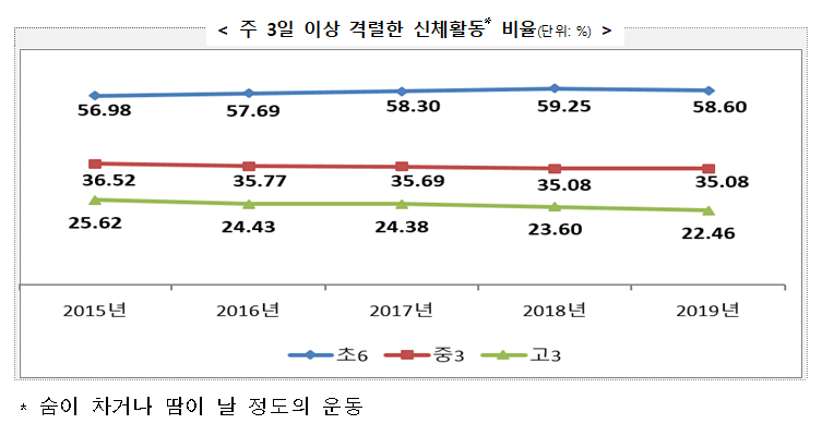 신체활동 지표 중 ‘주 3일 이상 격렬한 신체활동 비율’은 학교급이 올라갈수록 낮았다. 학교급별로는 중‧고등학생은 최근 5년간 감소 추세였고, 초등학생은 2018년까지 증가하였으나, 2019년에는 전년대비 소폭 감소하였다.