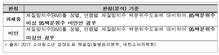 ※ 비만도 평가기준은 2017년 개정된 소아청소년 성장도표(체질량지수 기준)를 적용하였고, 최근 5년간 자료도 동일 기준 적용하여 환산하였음