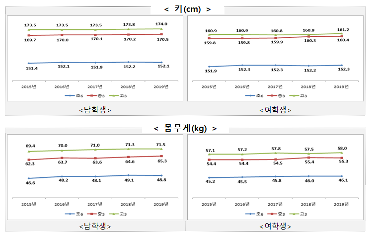 최근 5년간 학교급별 최고 학년의 평균 신장은 초등학생의 성장세는 큰 변화가 없는 반면, 중학생은 남녀 모두 지속적으로 증가하였고, 고등학생의 경우 2017년 이후 남녀 모두 증가하였다. 학교급별 최고 학년의 체중은 5년 전에 비해 남녀 모두 증가하였다.