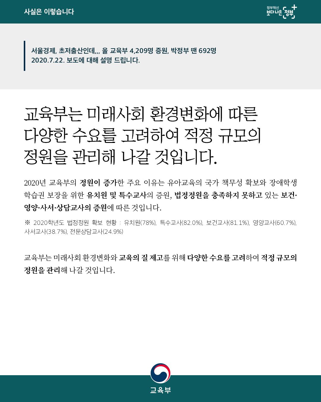 유치원 및 특수교사 및 법정정원을 충족하지 못하고 있는 교사 등의 증원으로 미래사회 환경변화에 따른 수요를 고려하여 적정규모의 정원을 관리해 나가겠습니다. 본문