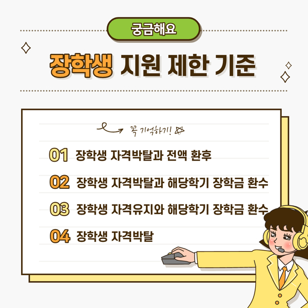 네 번째,장학생으로 품위를 현저히 떨어뜨리는 행동을 할 경우 정학, 퇴학 등의 교내 징계, 음주운전, 마약, 사기 등과 같은 사회 물의를 일으키는 행동을 했을 경우 장학생 자격박탈
