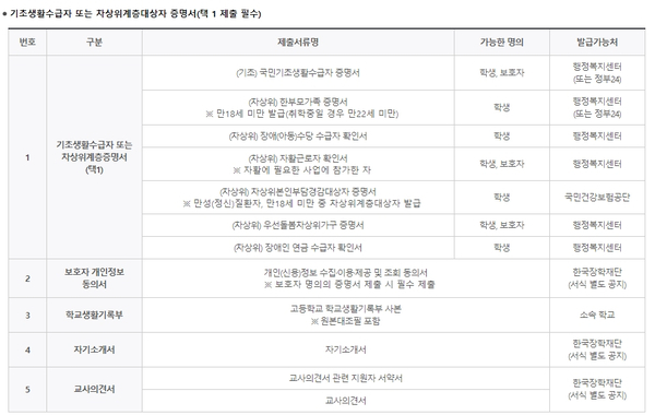 드림장학금을 신청하기 위해선 위와 같은 서류를 제출하여야 합니다. 우선, 기초생활수급자 또는 차·상위계층증명서 중 택 1은 제출 필수이며 기타 추가 서류도 제출하시면 됩니다. 서류별로 발급 가능처가 다르기 때문에 이를 잘 확인 하시고 준비해 주시면 됩니다.