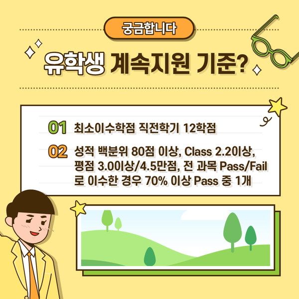 유학준비생은 신규 유학준비생으로 선발된 자로 고등학교 2~ 3학년으로 진학예정인 학생들을 대상으로 해외대학 진학을 위한 학업 장려비를 지원해주는데요. 2학년은 월 50만원, 3학년은 월 70만원을 지원해줍니다. 뿐만 아니라, 선발 후 익월부터 학년별 기준에 따라 지원해줘 2학년으로 선발된 장학생이 3학년으로 진학하게 되면 그 해 3월부터 3학년 기준에 따라 지원해준답니다.