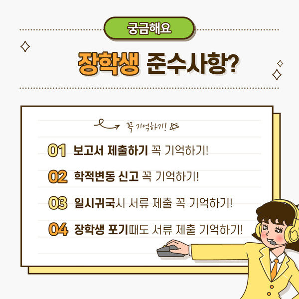 일시귀국의 경우는 유학생이 학기 중 30일을 초과하여 일시 귀국하고자 할 때의 서류제출인데요. 이때는 꼭 사전에 일시귀국요청서를 제출해 승인을 받아야 합니다. 물론 급박한 사정으로 인한 사전 제출이 불가능할 경우는 사후에도 가능하답니다. 장학생을 포기할 때도 꼭 장학생 포기확인서를 제출해야 합니다.