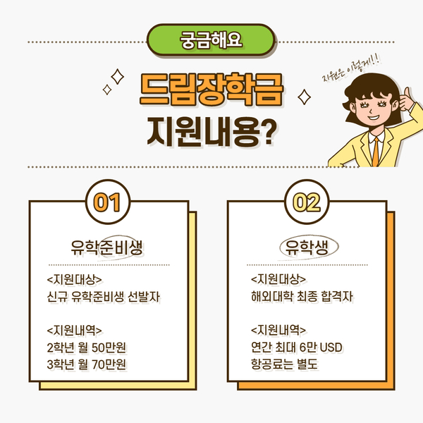 드림 장학금은 유학준비생(고등학생, 국내장학생), 유학생(대학생, 해외장학생)으로 나누어 지원하고 있습니다.