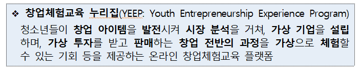 아울러, 「대한민국 청소년 창업경진대회」에 참여한 청소년들이 실제 창업을 하는 사례가 있어, 이 대회가 청소년 창업 인재 발굴과양성의‘발판’이 되고 있다는 점에서 더욱 주목할 필요가 있다.