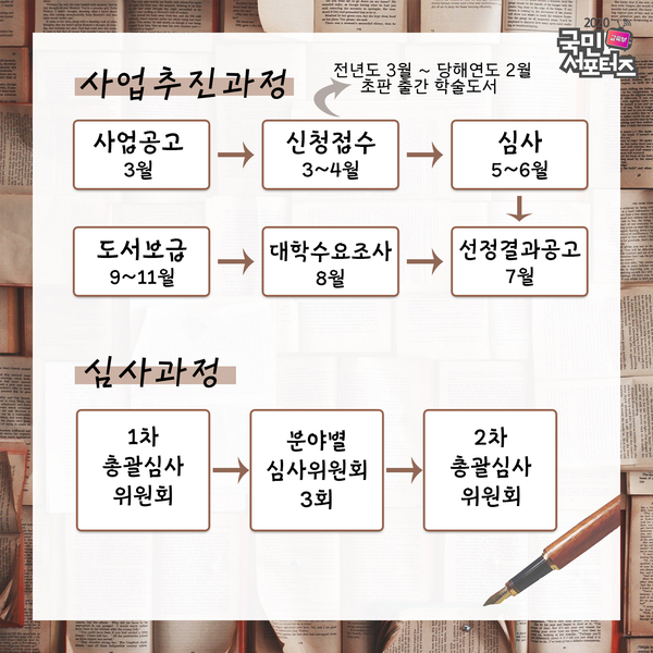 3월 즈음에 사업공고가 나오고3~4월에 신청접수를 받습니다. 5~6월 심사를 거쳐, 7월에 선정결과를 공고하는데요.책이 바로 보급 되는 것이 아니라.선정 이후 대학의 수요를 조사하여 선정도서를 구입하고, 9~11월에 각 대학 도서관에 보급하고 있습니다.