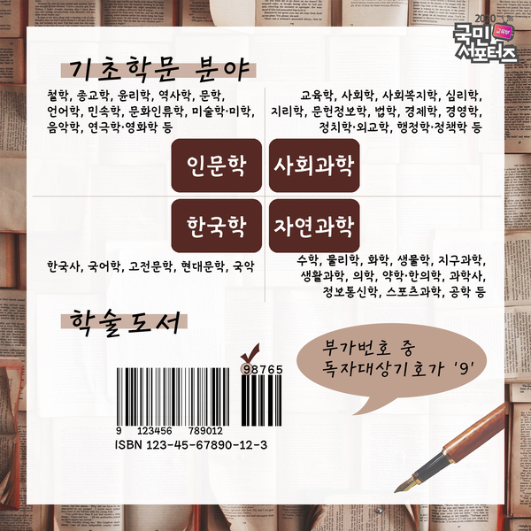 먼저 기초학문 분야와 학술도서에 대해 설명해 드릴게요!기초학문 분야란 대한민국학술원에 따르면 철학,역사학,문학,종교학 등을 포함하는 인문학과 법학,정치학,행정학,교육학 등을 아우르는 사회과학,그리고 한국사,국어학,고전문학 등이 해당하는 한국학,마지막으로 수학,물리학,화학,지구과학 등을 포함하는 자연과학을 의미합니다.또한,학술도서란 바코드 아래에 있는ISBN(국제표준도서번호)부가기호 첫 번째 자리에 위치한 독자대상기호가‘9’로 표기된 것으로 이 기준에 해당되는 기초학문 분야의 학술도서 중에서 우수학술도서가 선정되는 것이죠.