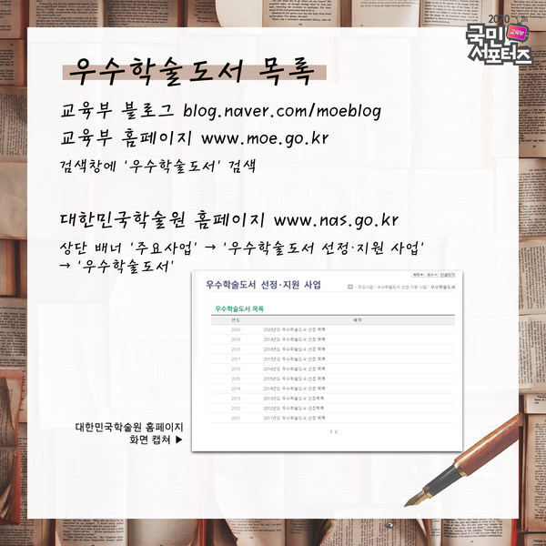 올해2020년도 우수학술도서 선정 목록은 교육부 블로그(https://blog.naver.com/moeblog/222029338430),교육부 홈페이지(ww.moe.go.kr),대한민국학술원 홈페이지(nas.go.kr)를 통해 확인하실 수 있습니다.특히,대한민국학술원 홈페이지에서는2002년부터 올해까지의 우수학술도서 목록을 한눈에 볼 수 있습니다.