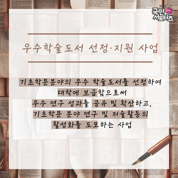 기초학문 분야의 우수학술도서를 선정하고,선정된 도서를 여러 국내 대학에 보급함으로써 기초학문 분야의 연구와 저술 활동이 더 활발할 수 있도록 돕기 위해 추진되고 있습니다. 2002년부터 꾸준히300여개의 대학도서관에10만여 권의 우수학술도서를 보급하고 있으며,이렇게 보급된 도서는 교수와 학생들의 연구 및 학업에 유용하게 이용되고 있습니다.