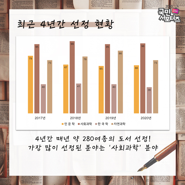 최근4년간 선정된 우수학술도서의 현황 인데요!매년 약280여종의 도서가 우수학술도서로 선정되었고 가장 많은 종의 도서가 선정된 분야는 바로 사회과학 분야입니다.올해 인문학에서는 김상범의<(당송시대의)신앙과 사회>를 비롯한66종,사회과학에서는 이원우 외의<(4차 산업혁명 시대의)기술혁신과 규제정책>을 비롯한96종,한국학에서는 김성수의<(미디어로 다시 보는)북한문학:『조선문학』(1946~2019)의 문학·문화사 연구>를 비롯한36종,자연과학에서는 이병욱 외<(4차 산업혁명을 위한)융합 개론>을 비롯한73종의 도서가 선정되었습니다.올해에도 사회과학이 가장 많이 선정된 것을 확인할 수 있습니다.